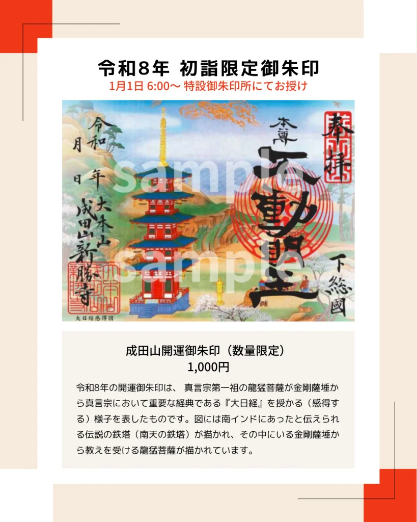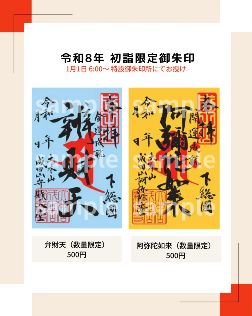 令和8年 成田山開運御朱印・初詣限定御朱印(弁財天・阿弥陀如来)のご案内 2025 12/13 初詣 令和8年を迎えるにあたって、特別な御朱印を授与いたします。 授与場所:特設御朱印所(大本堂西側広場)期 間:令和8年1月1日 6:00~(なくなり次第終了) ※開運御朱印と初詣限定御朱印2種(弁財天・阿弥陀如来)の3枚セットを受けられた方には、クリアファイルをお授けします。(数量限定) 初詣 年末恒例のすす払い その他の記事 2025年12月 (7)2025年11月 (13)2025年10月 (5)2025年9月 (13)