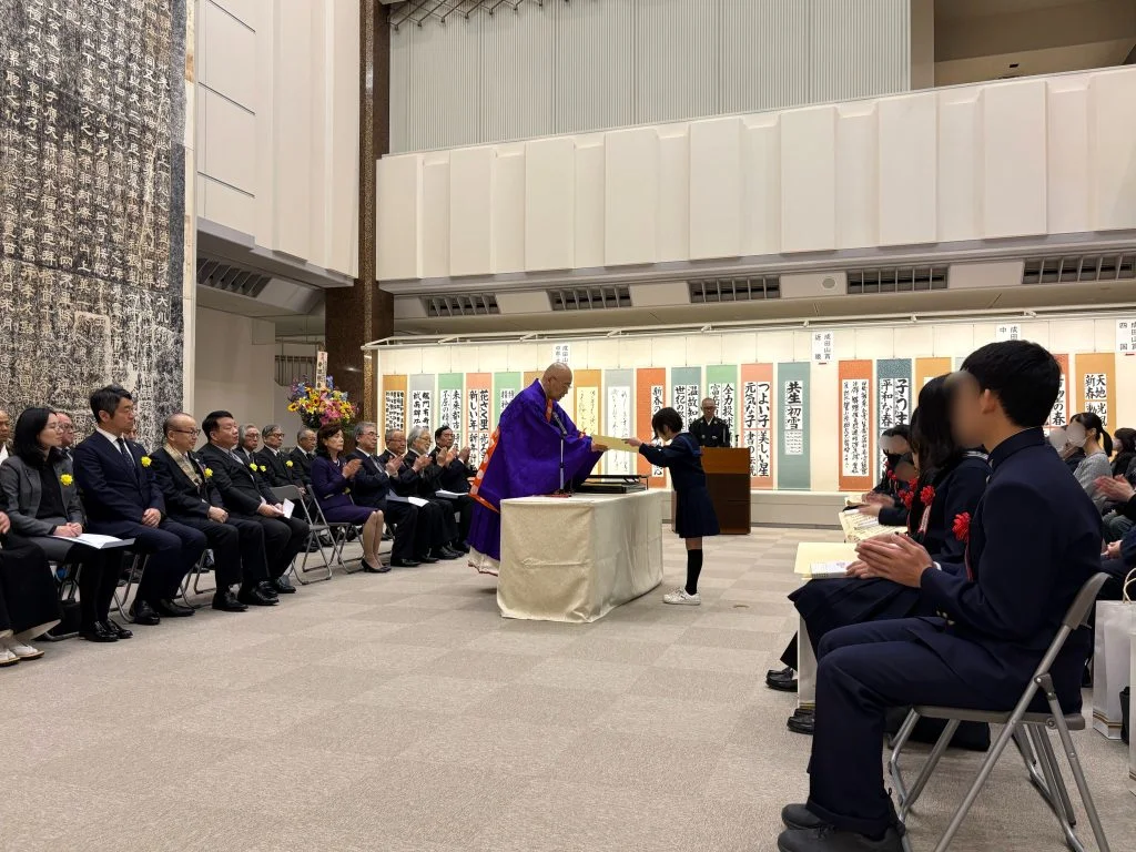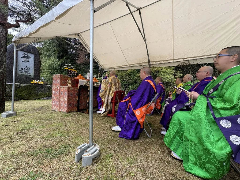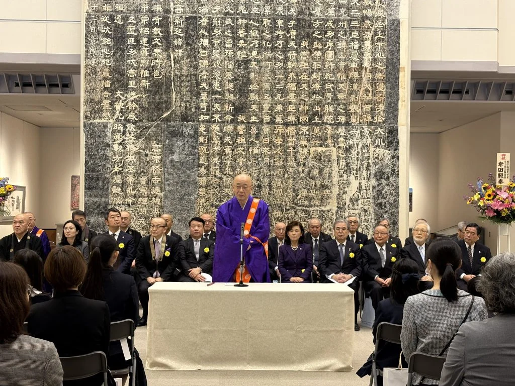 第42回成田山全国競書大会授賞式が成田山書道美術館で開催されました。はじめに美術館前庭で岸田照泰貫首大導師のもと筆魂碑供養会を厳修。土橋靖子大会実行委員長をはじめ委員の先生方と受賞者が参列して献花を行い、墨筆に感謝を捧げ、書道文化の発展を祈りました。
