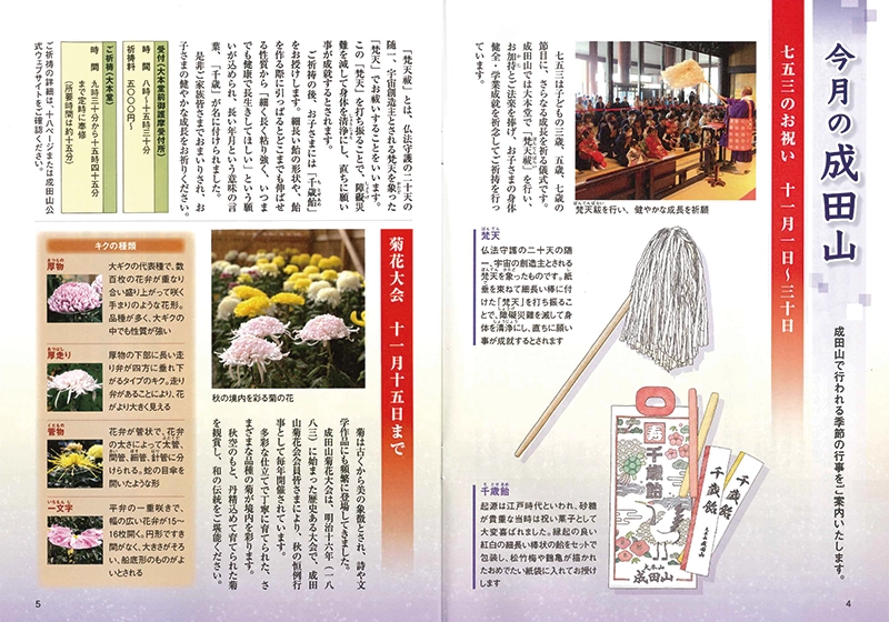 | 今月の成田山 | 七五三のお祝い / 菊花大会 / 紅葉まつり / お守り紹介 |