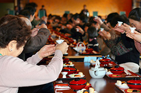 また、講社・奉賛会は、御護摩参拝後に光輪閣で成田山伝統の精進料理をいただく坊入を受けることができます。坊入は、御本尊さまにお供えした食材による精進料理をいただいて、お不動さまとの御縁を深め、講員・会員同士が心の交流をはかる大切なひとときです。